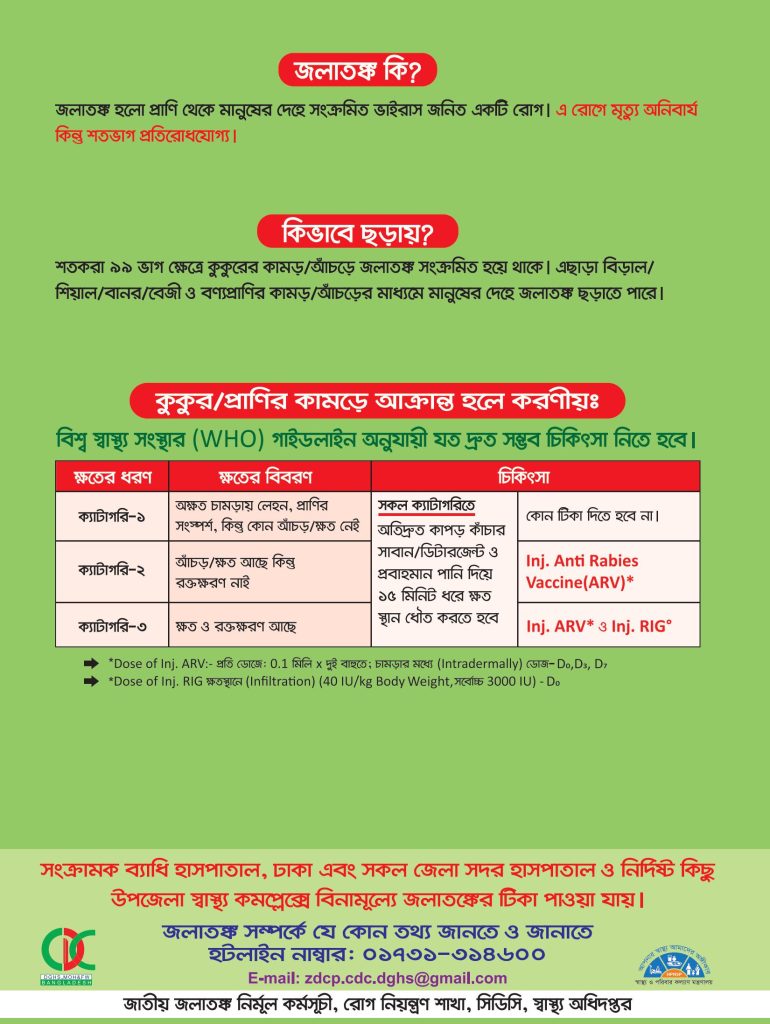 *শুধু গৃহপালিত কুকুর ও বিড়ালের কামড়ের পর যদি সেই প্রাণী পরবর্তী ১০ দিন সম্পূর্ণ সুস্থ থাকে, তবে ১৪ ও ২৮তম দিনের টিকা না দিলেও হবে। জলাতঙ্ক মস্তিষ্কের এমন একটি গুরুতর অসুখ, যেখানে মৃত্যুর হার অনেক বেশি।